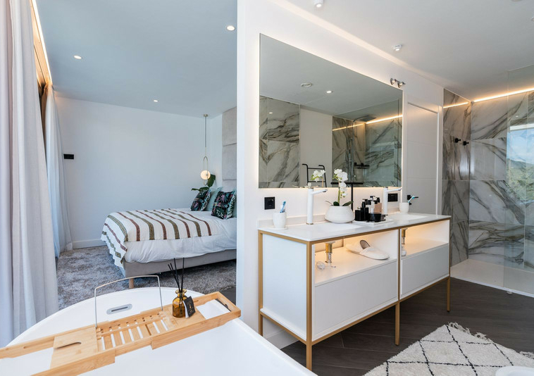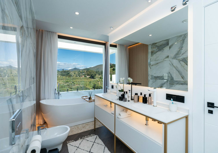 En la primera planta hay otra dos dormitorios ensuite y de esta planta hay acceso al grande solarium con jacuzzi. Hay vistas panoramica a los mountañas, golf, campo y hasta al mar.