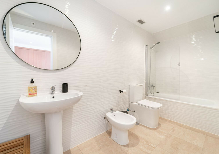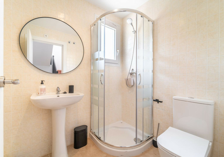 La planta baja cuenta con una acogedora sala de estar de planta abierta que se abre perfectamente a una gran terraza orientada al sur. Este nivel también incluye una cocina moderna y totalmente equipada, un baño completo con ducha a ras de suelo y un dormitorio con acceso directo a la terraza.