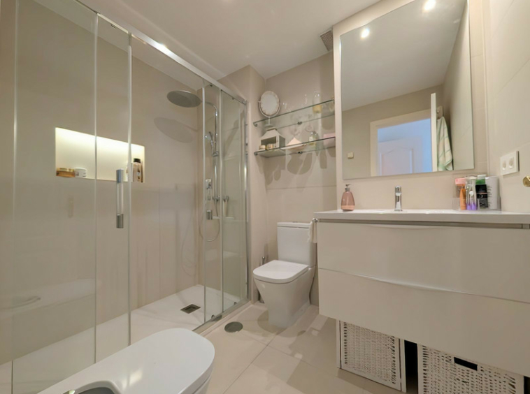 La planta principal se compone de un elegante hall de entrada, un amplio salón-comedor con acceso directo a la terraza con vistas a los jardines comunitarios y piscinas, cocina totalmente equipada con lavadero independiente, dos dormitorios de invitados que comparten un baño familiar con ducha tipo walk-in, y un dormitorio principal con baño en suite, también con ducha walk-in. Todos los dormitorios son amplios y disfrutan de abundante luz natural.