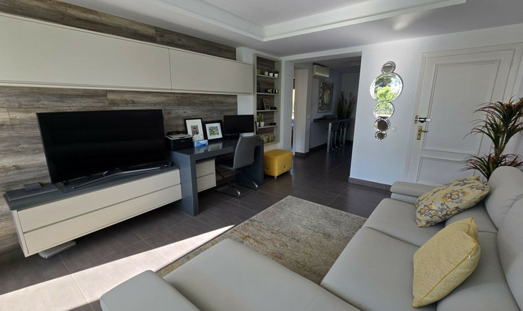 El salón fluye hacia tres puertas de patio acristaladas que conducen a una increíble terraza orientada al sur. Las vistas vírgenes de la piscina, las zonas de jardín, los pinos y el mar mejoran la belleza de la cizalladura de este apartamento.