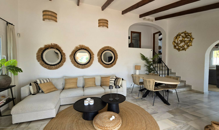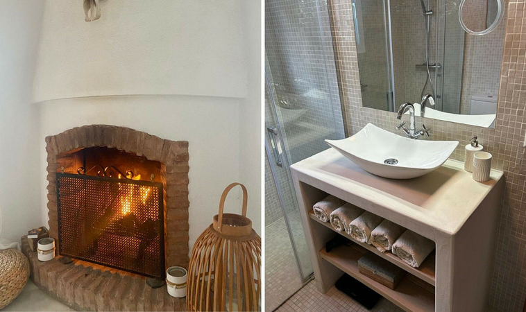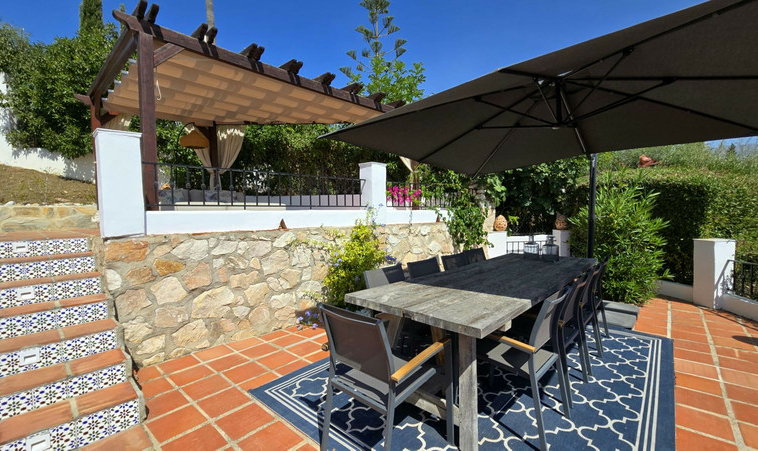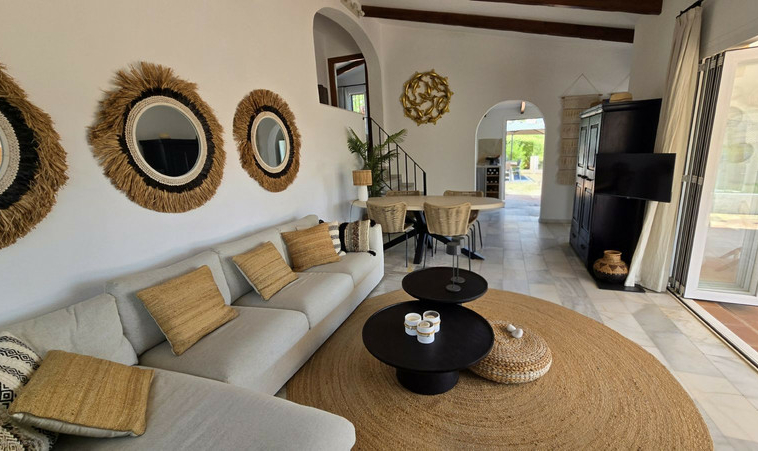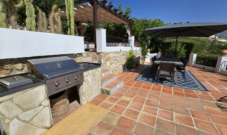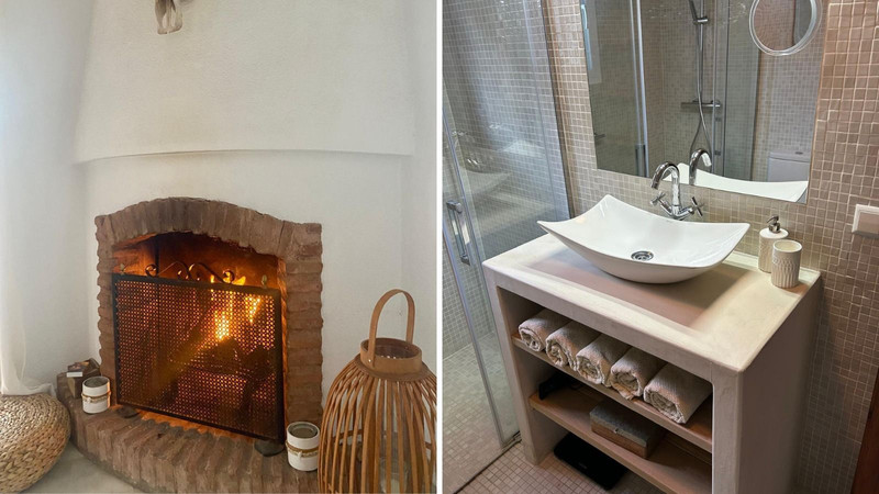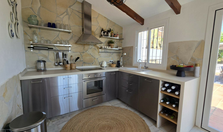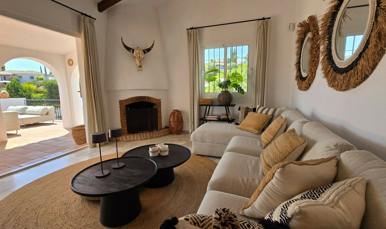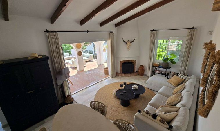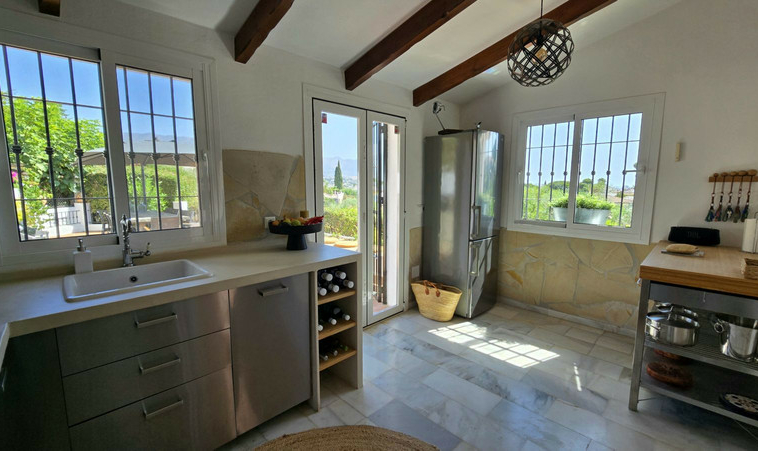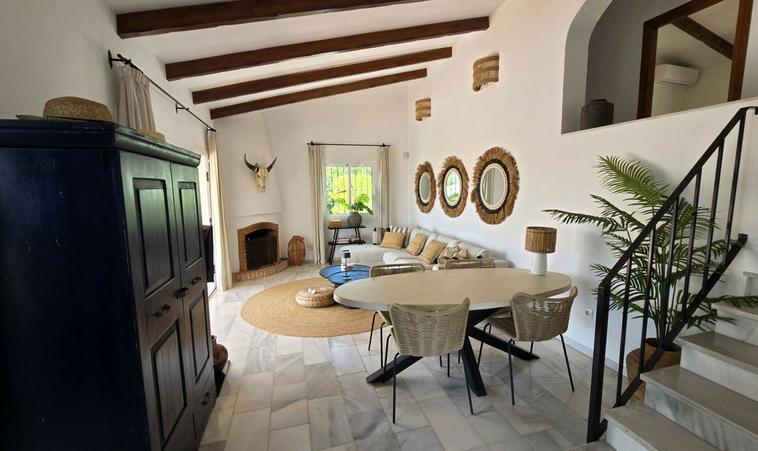 AL SUBIR A LA VILLA, SE ENCUENTRA UNA GRAN ZONA DE ESTAR CON TERRAZA ABIERTA, SOFÁS Y MESA DE CENTRO, CON IMPRESIONANTES VISTAS A LAS MONTAÑAS Y AL CAMPO. Se accede a la propiedad a través de una terraza cerrada de 15 m² con chimenea de leña abierta y puertas plegables de doble cristal que dan al salón, bien presentado y decorado, con chimenea de leña cerrada, sofás y mesa de comedor. La estancia es luminosa y acogedora, con vigas de madera en toda la planta, incluida la cocina.