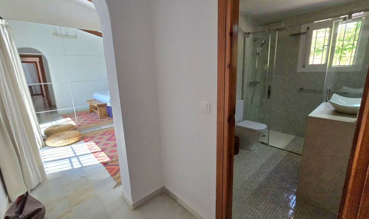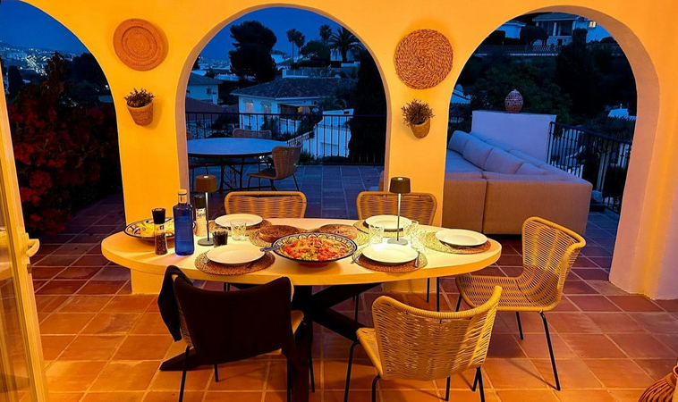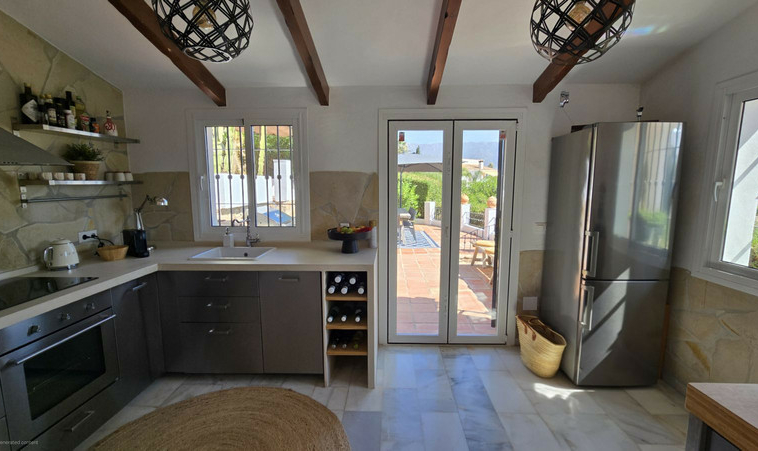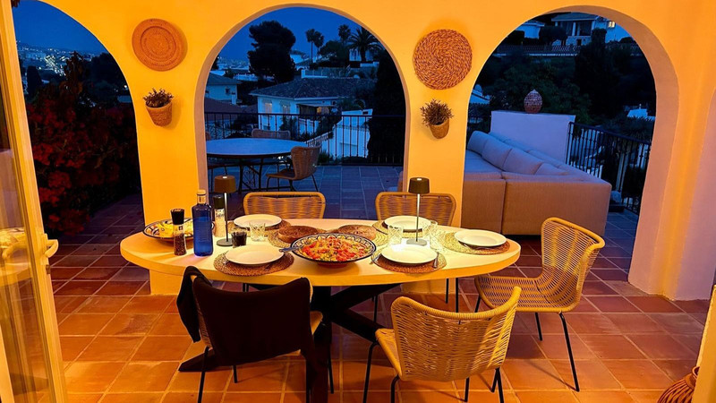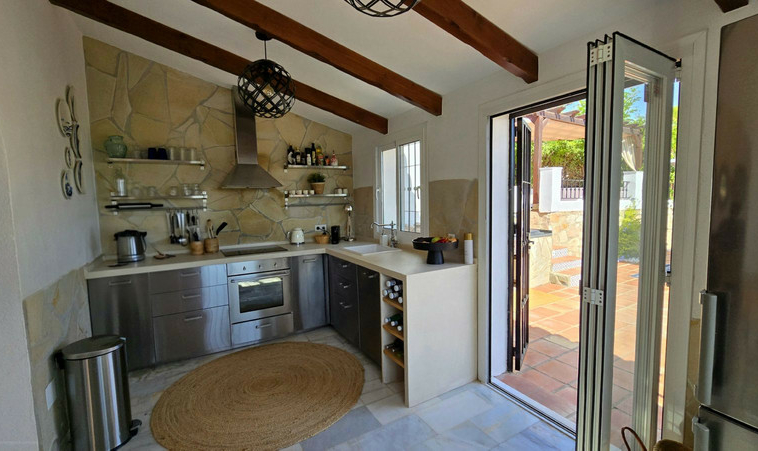 A la derecha del salón se encuentra la cocina totalmente equipada con acabados cromados, bien distribuida y con electrodomésticos de alta calidad. Las puertas plegables facilitan el acceso a dos terrazas. BIEN AMUEBLADA CON UN GALARDÓN Y TUMBO, LA PLANTA BAJA CUENTA CON UNA MESA DE COMEDOR A LA SOMBRA PARA 8 PERSONAS Y UNA ZONA DE BARBACOA, CON VISTAS INCREÍBLES.