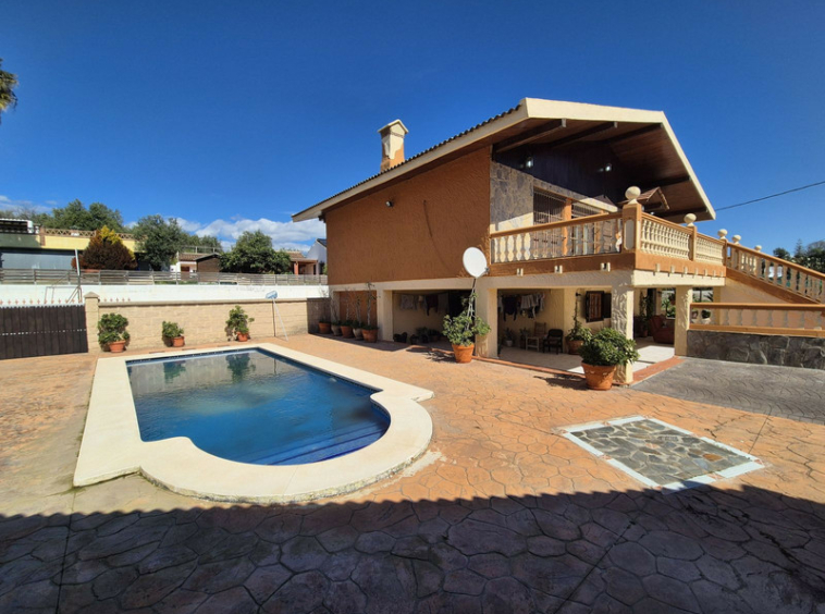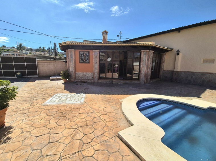 Piscina con terraza circundante, ideal para el entretenimiento.