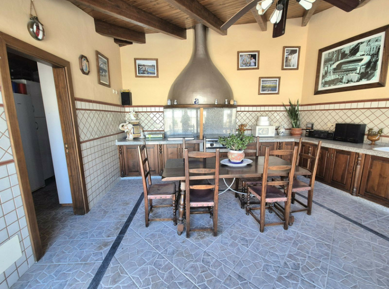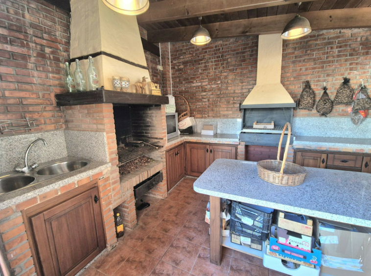 Dos cocinas independientes cubiertas: una con barbacoa y otra completamente equipada con lavadero, lavavajillas, trastero y comedor.