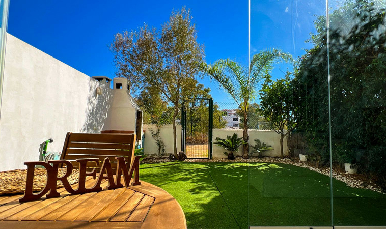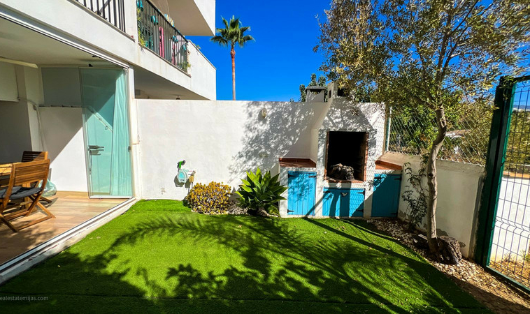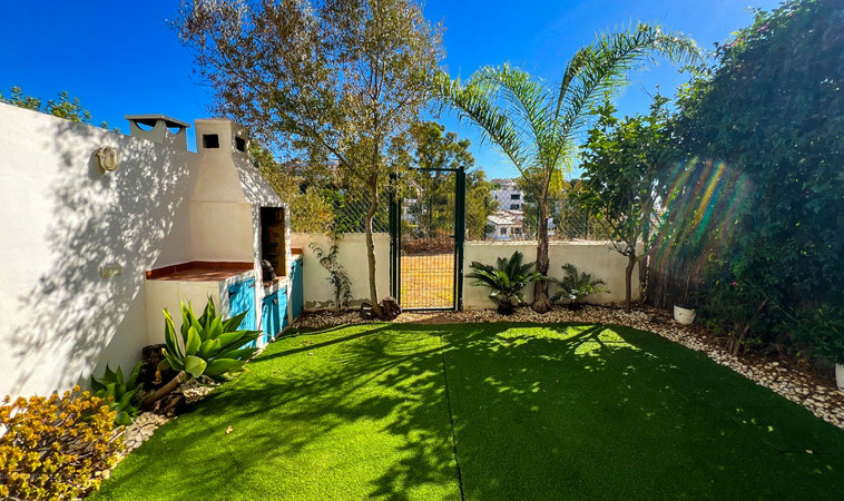 Gran zona exterior ajardinada con césped artificial y barbacoa, ideal para reuniones con familiares y amigos