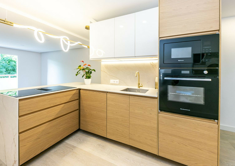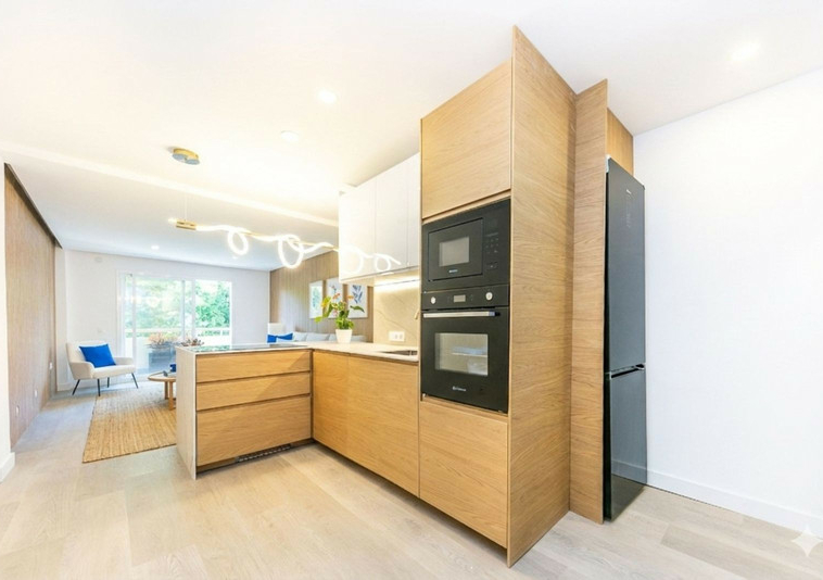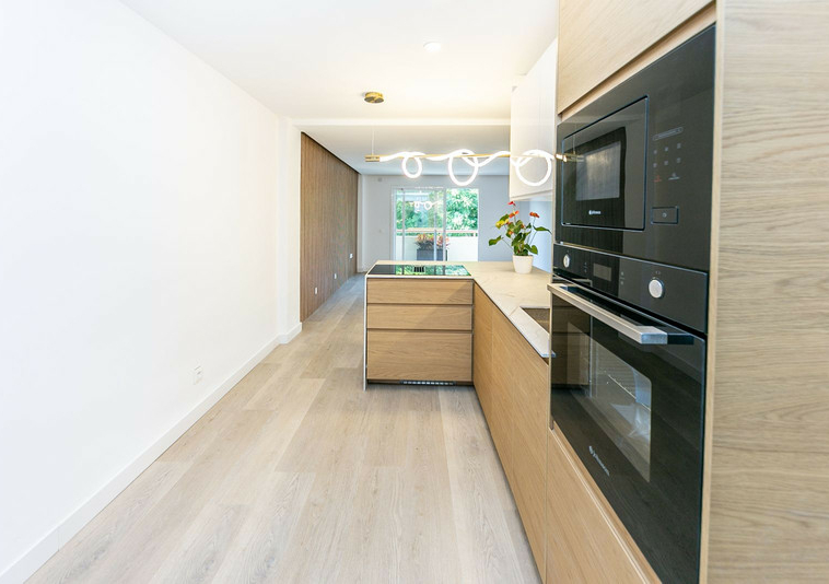 La cocina está completamente amueblada y equipada, con electrodomésticos nuevos y lavavajillas integrado, además de un lavadero independiente separado por puerta de cristal que aporta luz y continuidad visual.