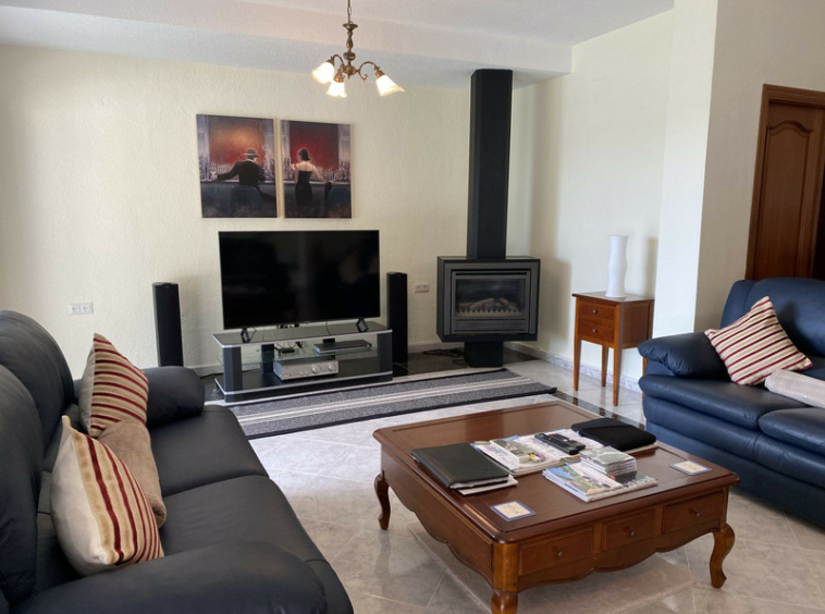 El luminoso y acogedor salón cuenta con una chimenea de gas.
