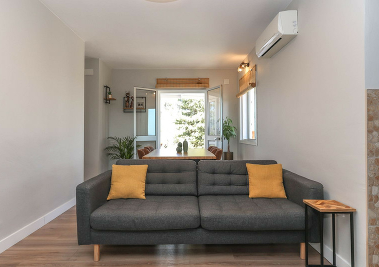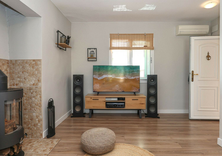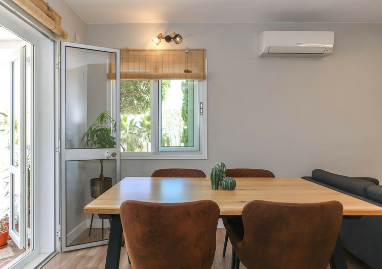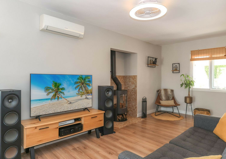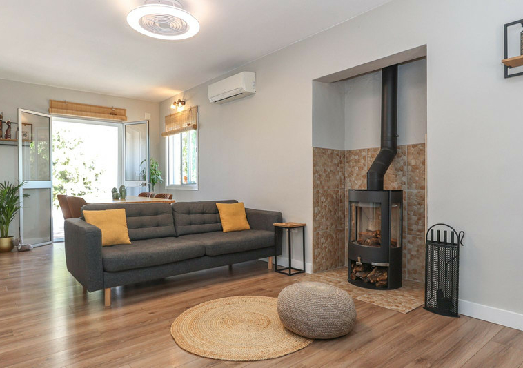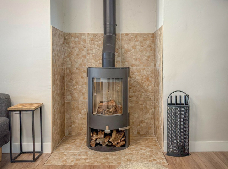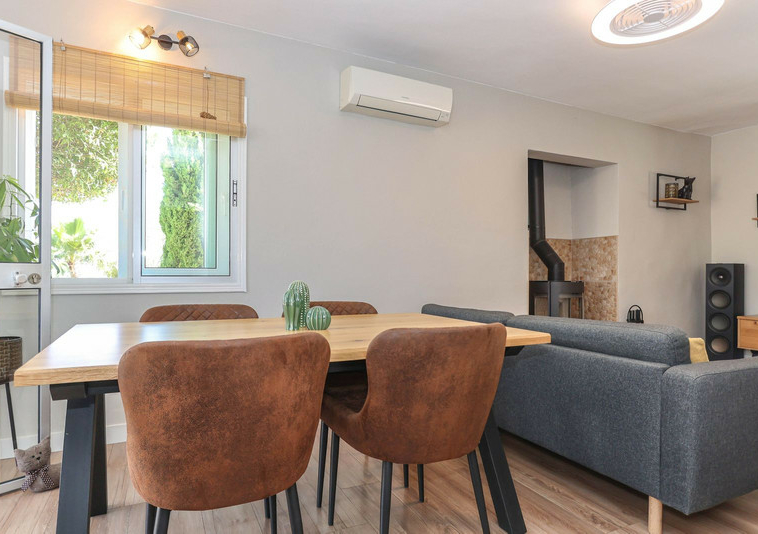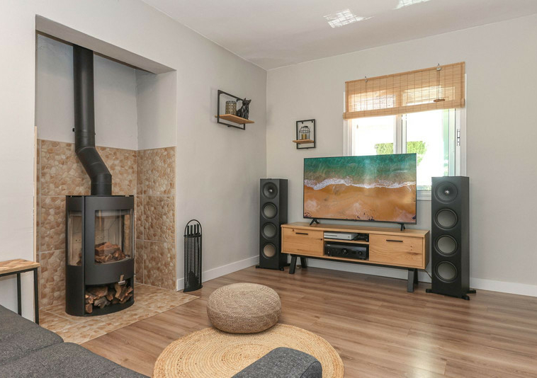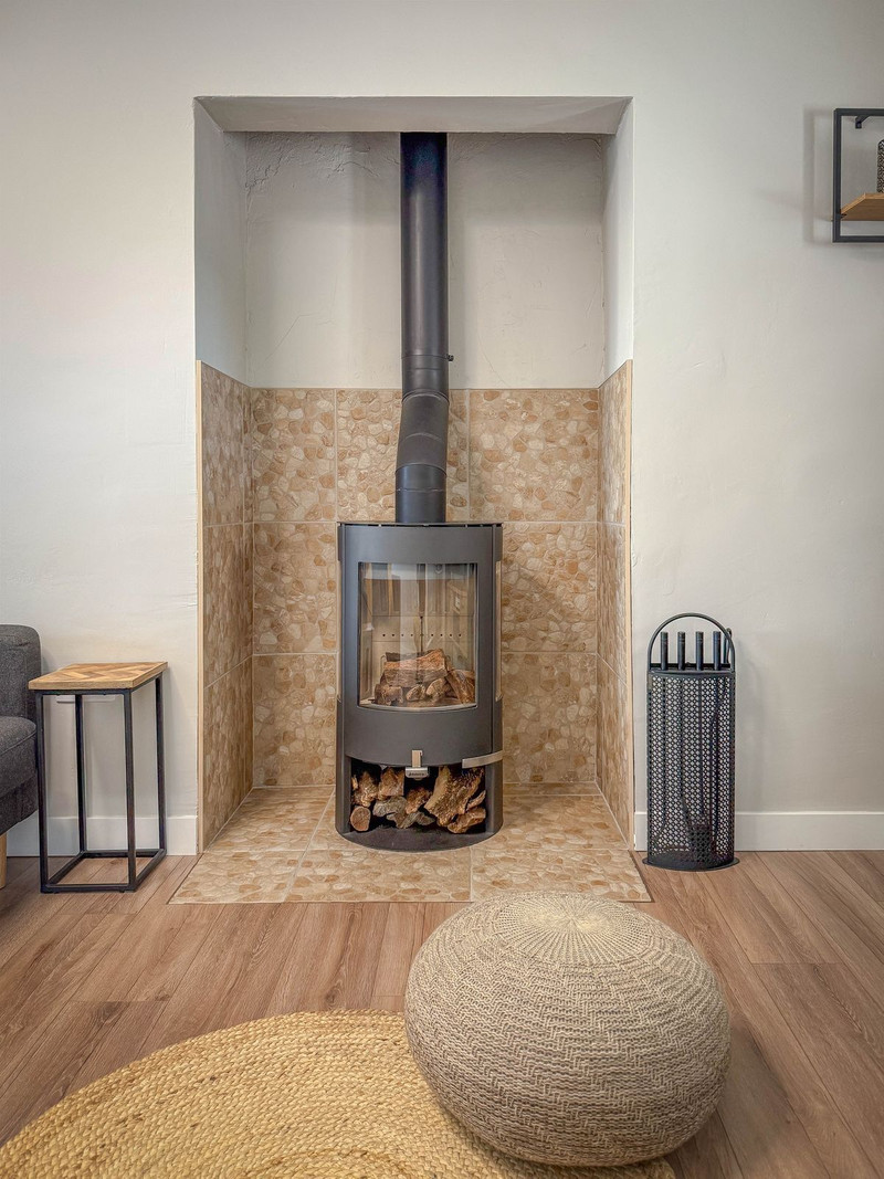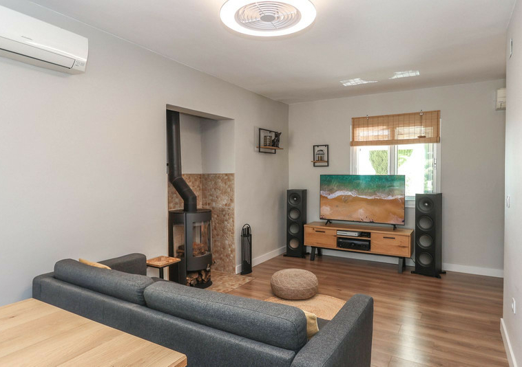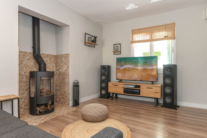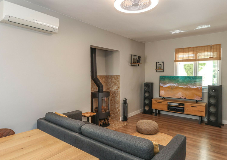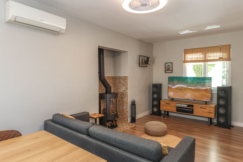 Entre en un acogedor y moderno salón, equipado con una elegante estufa de leña para los meses más fríos. Las puertas francesas se abren a la terraza lateral y a la zona de barbacoa, integrando a la perfección el interior y el exterior.