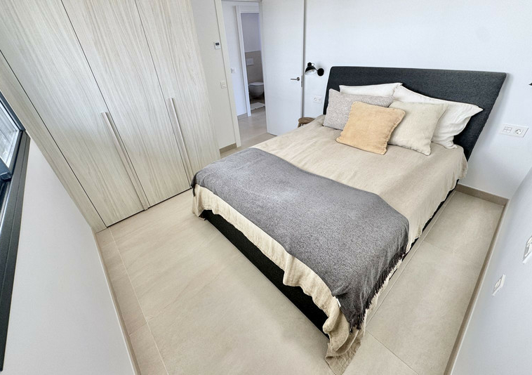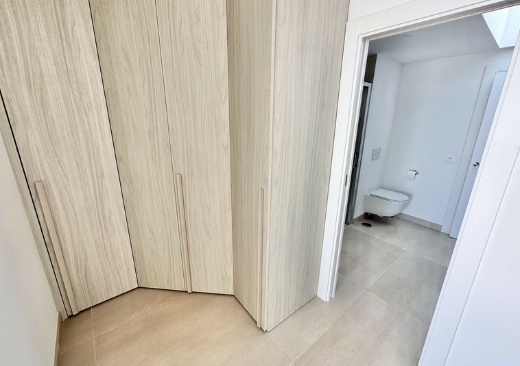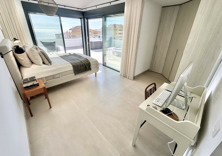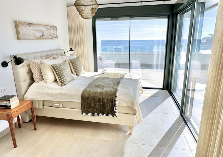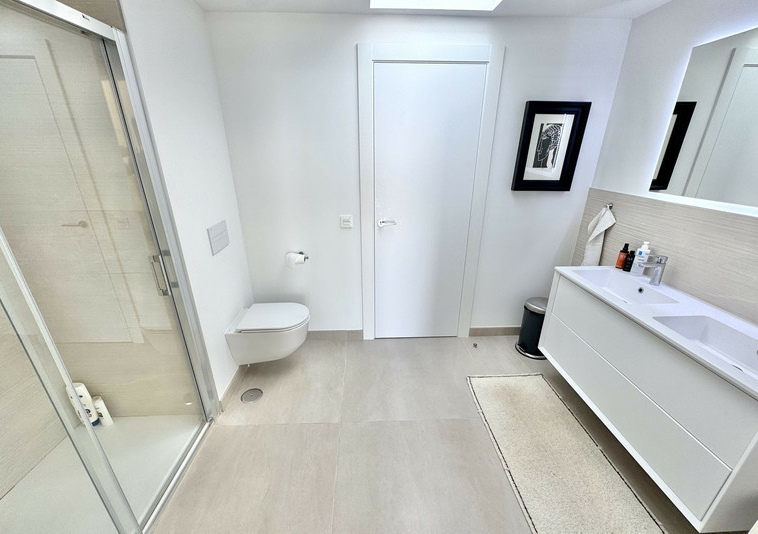 3 dormitorios dobles, 2 lujosos cuartos de baño con ducha, un precioso espacio diáfano moderno con salón, comedor y cocina de diseño equipada. Lavadero independiente con tomas de agua para lavadora y secadora. Fantásticas vistas al mar orientadas al suroeste desde ventanas panorámicas, suelos de primera calidad en toda la vivienda y un sistema domótico de última generación. Todos los dormitorios cuentan con armarios empotrados que ofrecen un amplio espacio de almacenamiento.