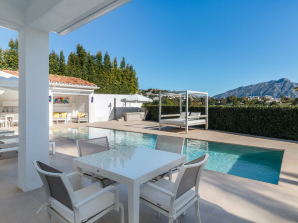 Descubra el epítome de la vida de lujo con esta impresionante villa adosada, perfectamente situada junto a la playa en Marbella. Con cinco espaciosas habitaciones y 5,5 baños, esta casa está diseñada para aquellos que aprecian las cosas buenas de la vida. La propiedad está ubicada en una parcela doble, con jardines privados maduros que ofrecen un escape sereno del ajetreo y el bullicio.