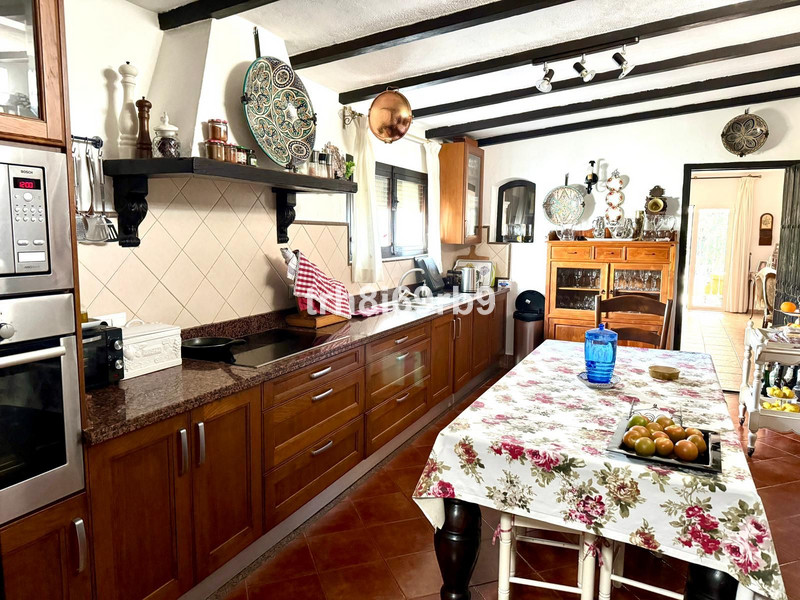 Al lado se encuentra la amplia cocina, con toques rústicos y comodidades modernas y un amplio espacio para una mesa que puede alojar cómodamente hasta 8 personas. El garaje privado es amplio para dos coches a la vez que sirve de despensa y trastero con estanterías de pared. Esta villa se distribuye con cuatro dormitorios – 3 cuentan con baño en-suite, ofreciendo privacidad y comodidad, mientras que un trastero cerca de la cocina ofrece potencial para crear un dormitorio adicional.