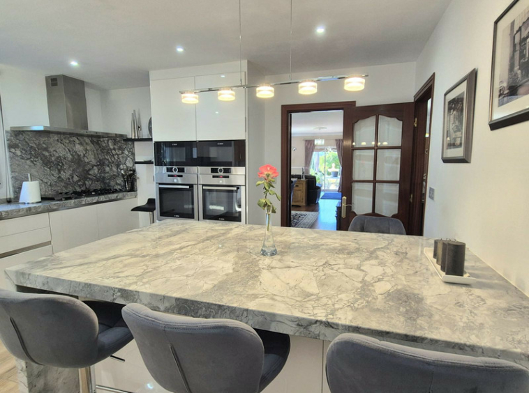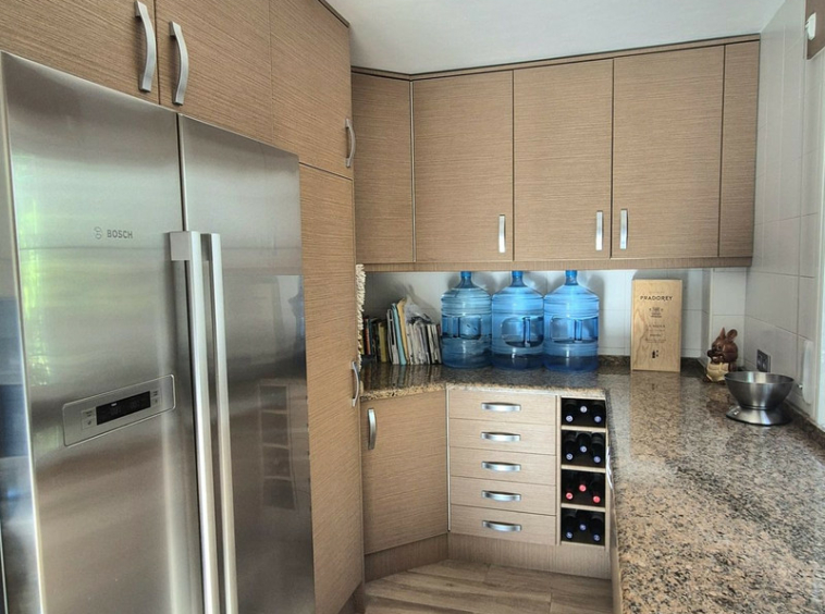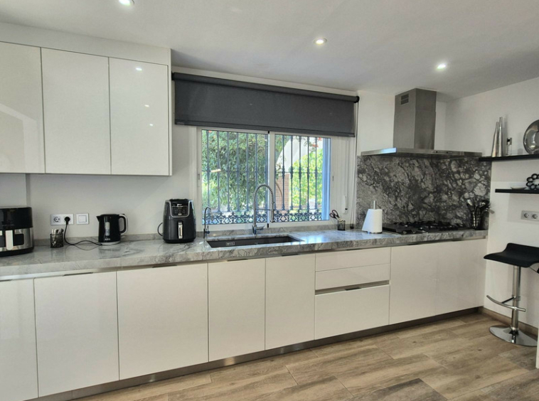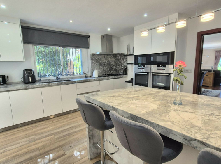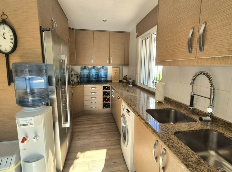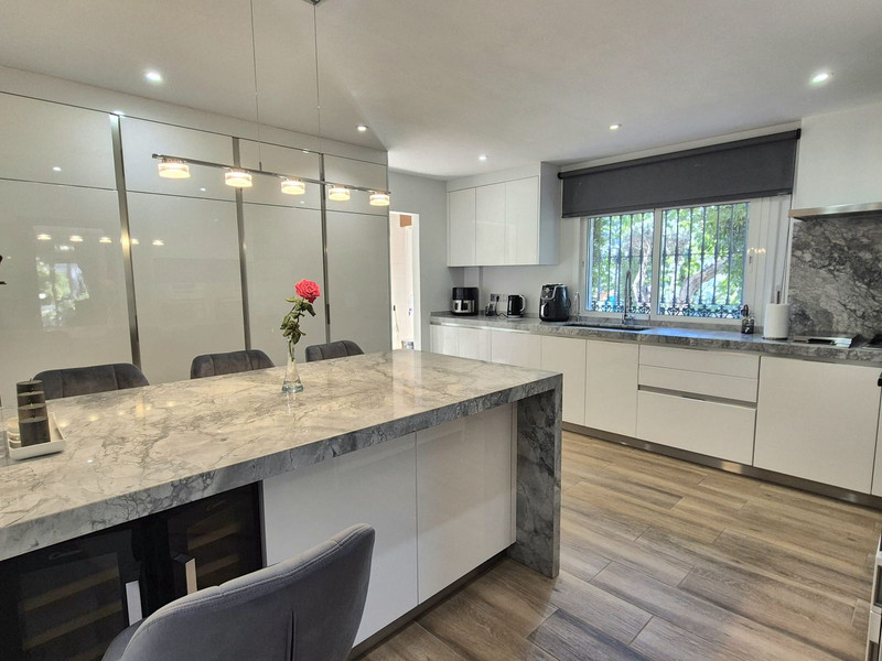 La espaciosa cocina cuenta con horno doble Bosch con ventilador y microondas, además de una placa de gas Bosch de 5 fuegos con extractor. También incluye una barbacoa Miele, lavavajillas Siemens, fregadero doble extragrande, dos cubos de basura integrados, frigorífico y congelador integrados de gran capacidad y dos despensas. Dispone de una amplia isla de mármol gris y blanco con armarios de almacenaje y una vinoteca doble. La cocina comunica con el lavadero.