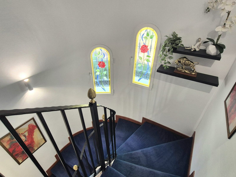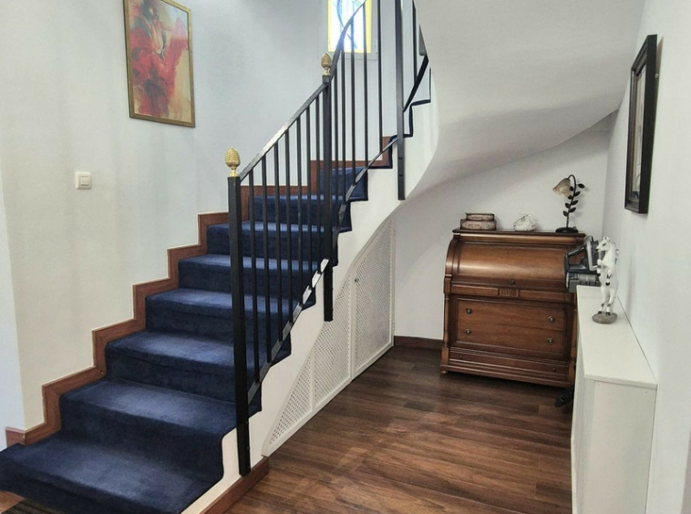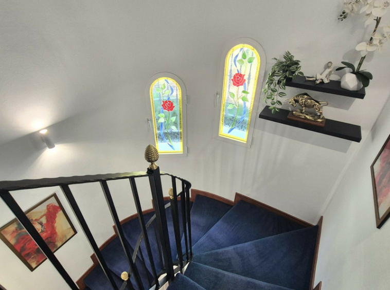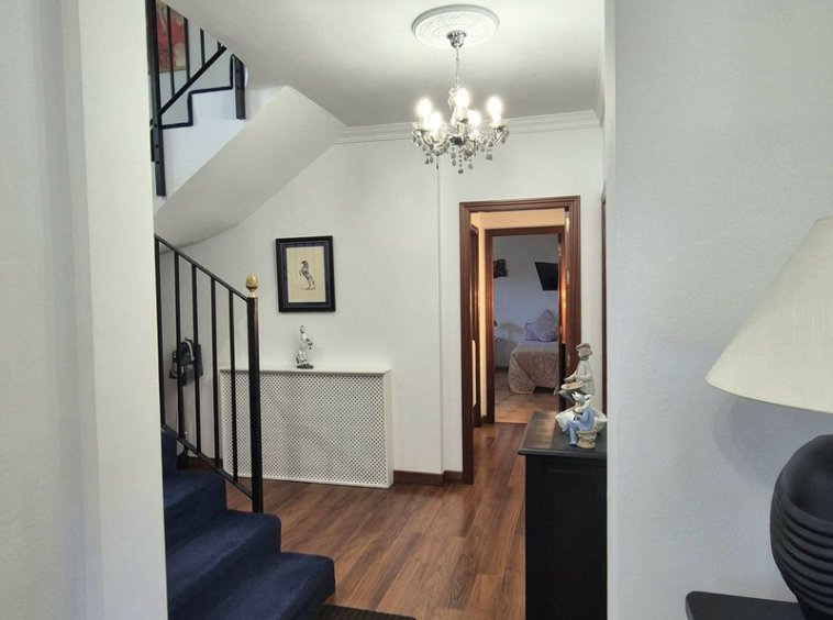 Escalera curvada a la planta superior. A la derecha de la escalera se encuentra el estudio/dormitorio/despacho. Más adelante, en el rellano con aire acondicionado, se encuentra el baño familiar con inodoro, bidé, lavabo con mueble y bañera con ducha, radiador para calefacción central, ventana oscilobatiente y armario.