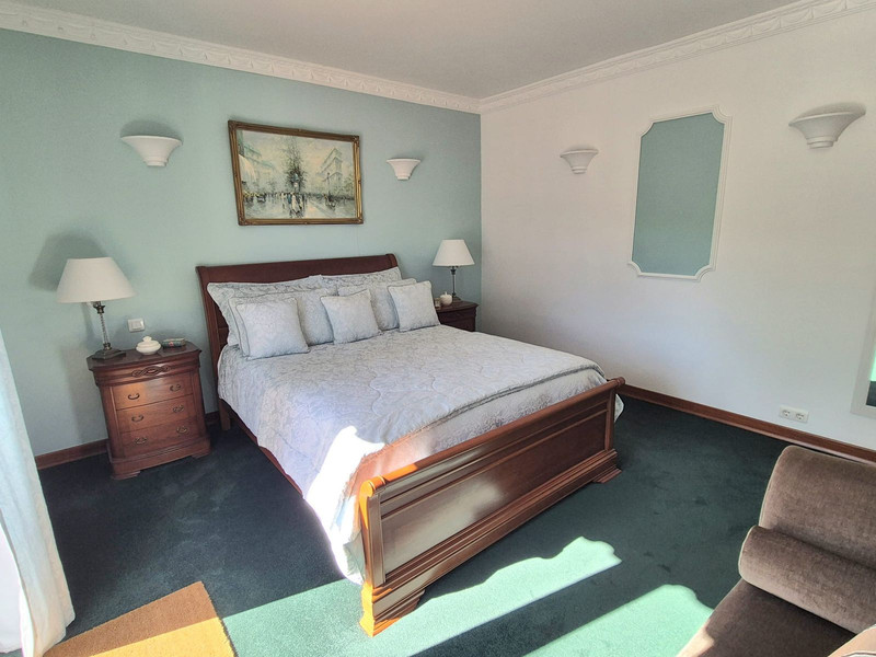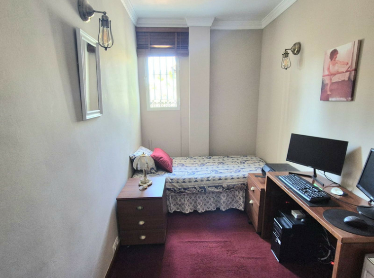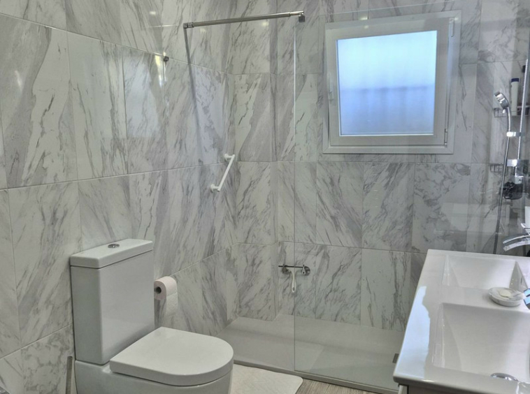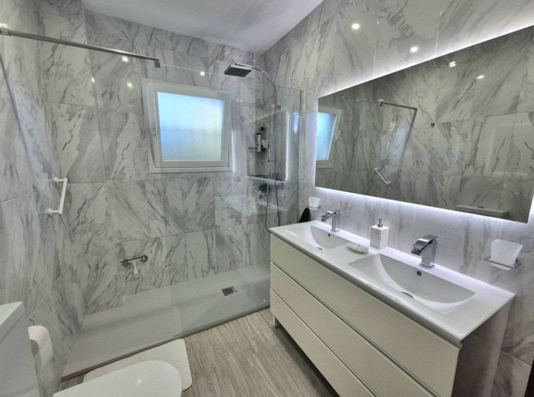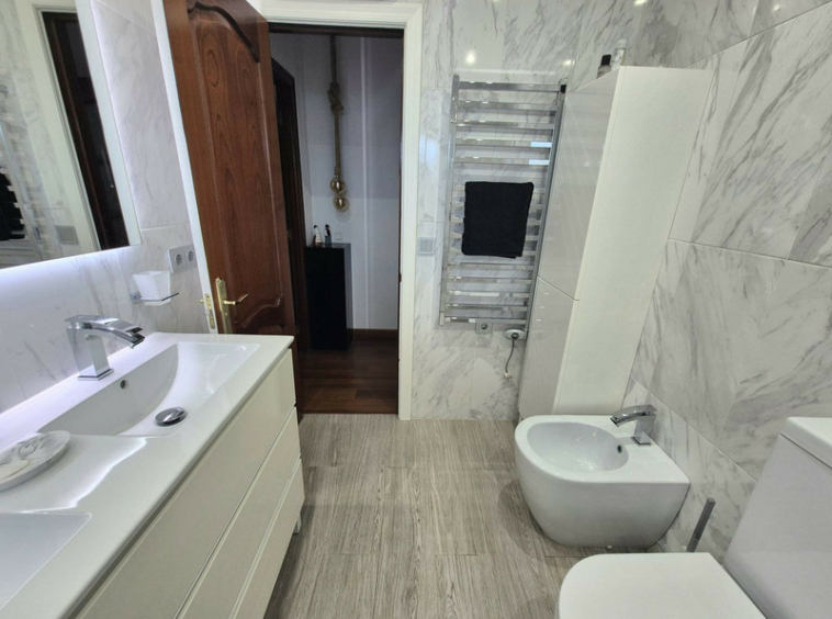 Amplio dormitorio doble con armarios empotrados dobles, radiador para calefacción central y ventana orientada al norte con vistas al jardín delantero. El baño privado está equipado con sanitarios Porcelanosa, bidé, inodoro y ducha, lavabo doble, ventana oscilobatiente, toallero calefactado y acceso desde el vestíbulo con calefacción central.