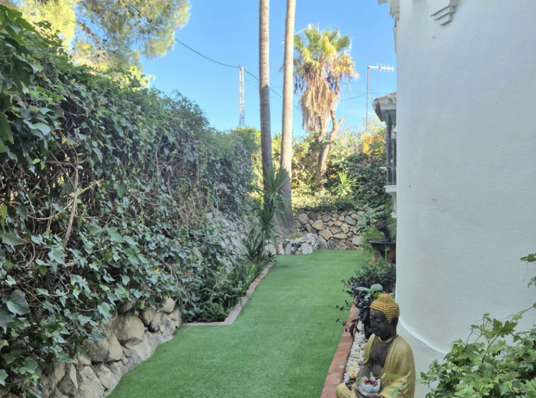 Construida en dos plantas, la propiedad cuenta con una distribución inteligente y acabados de primera calidad en toda la vivienda. Se accede a la propiedad a través de una puerta peatonal que conduce a una puerta de entrada de alta seguridad, la cual da paso a un amplio y luminoso recibidor con un bonito suelo de madera. Desde aquí se accede al luminoso salón-comedor orientado al sur, con acceso a las terrazas y jardines traseros, así como a la cocina equipada, un dormitorio doble en la planta baja con baño privado con ducha.