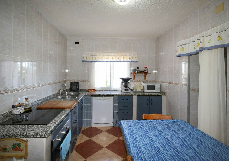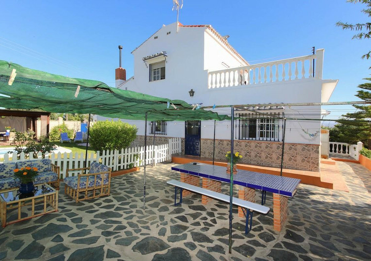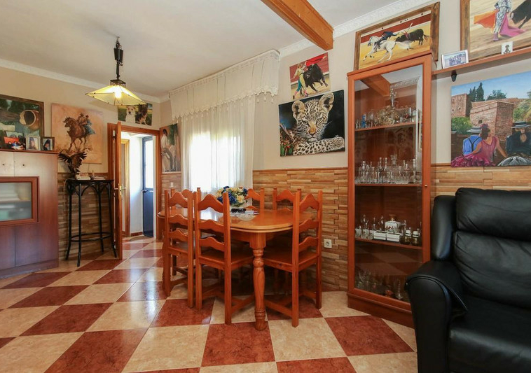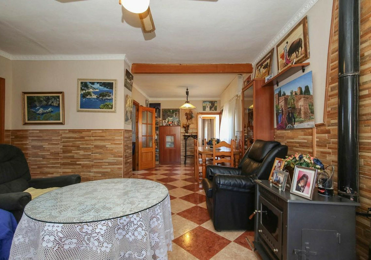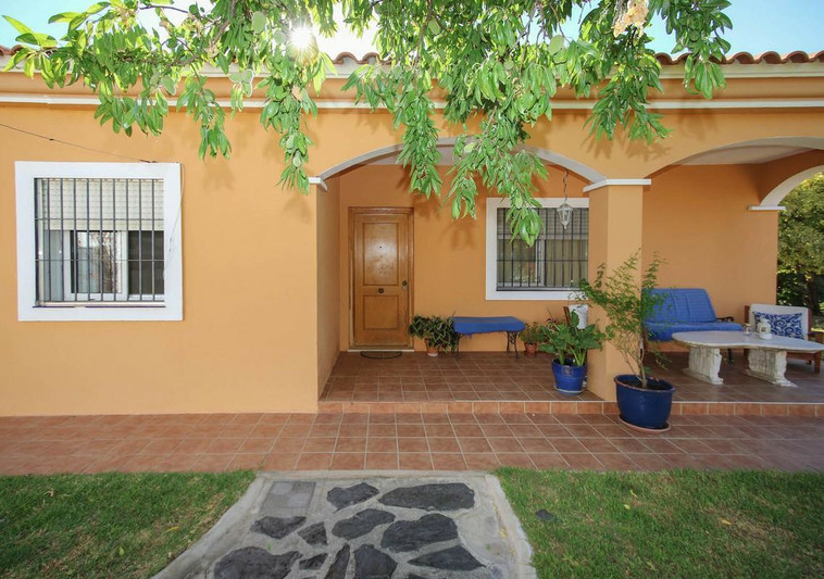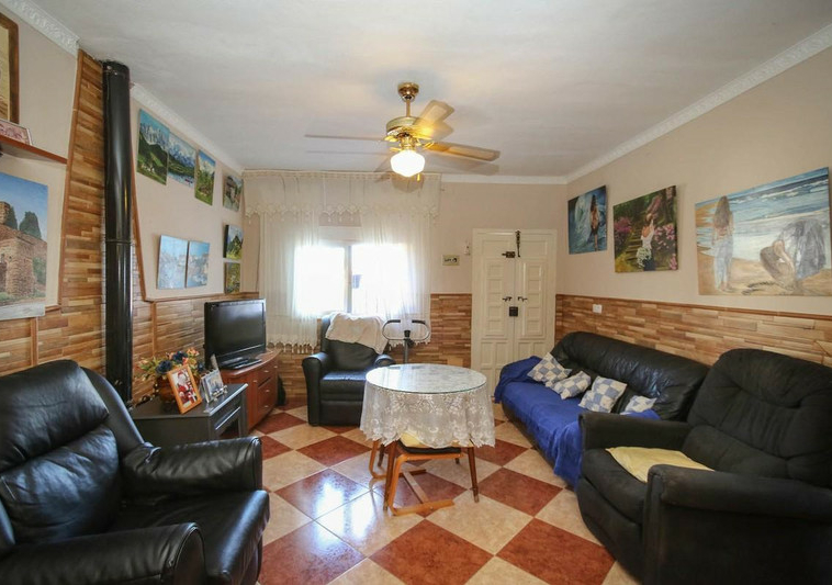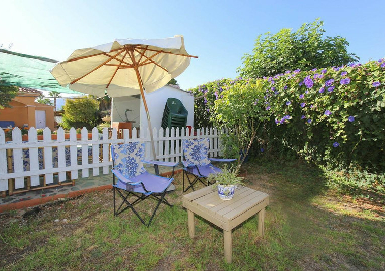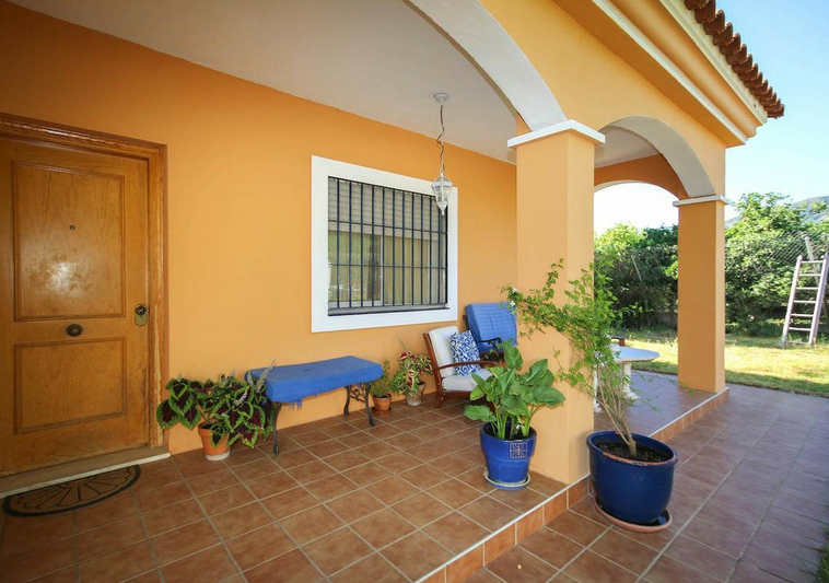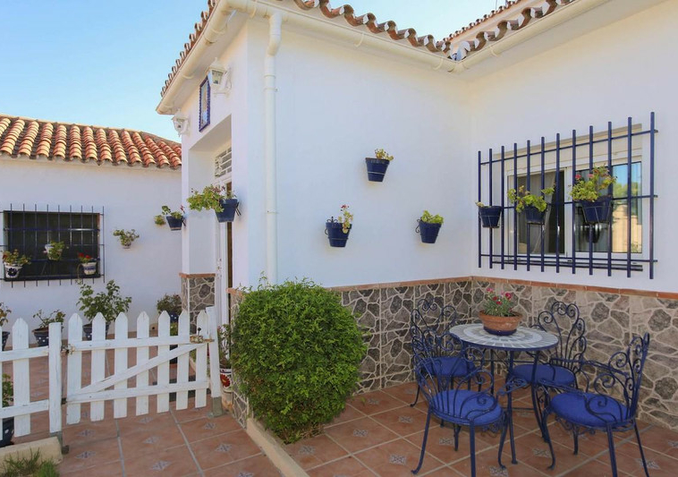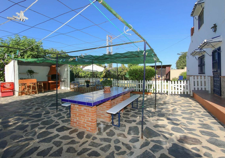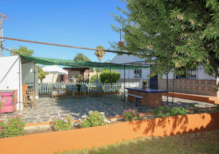 Pasando a la segunda casa. Un pequeño jardín le da la bienvenida a esta propiedad con un gran almendro seguido de un porche cubierto con arcos. Esta propiedad cuenta con mucha luz natural. Detrás de la segunda casa hay limoneros y naranjos así como un invernadero.