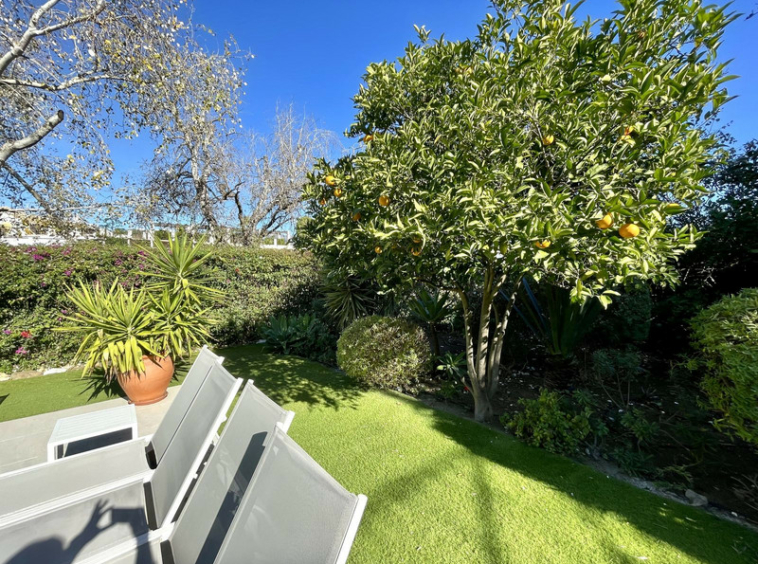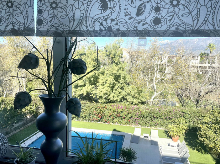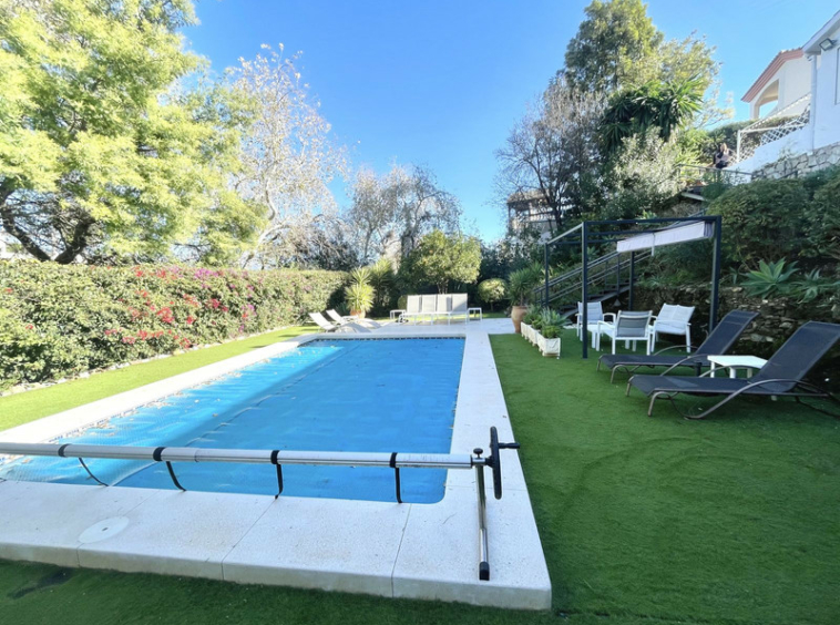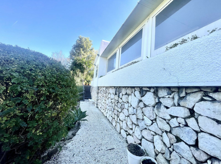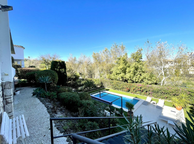 El exterior de la villa es donde la propiedad realmente destaca. Situadas en un entorno mediterráneo aislado, las terrazas de varios niveles ofrecen numerosos espacios privados para tomar el sol, cenar al aire libre y celebrar reuniones sociales. Unas elegantes escaleras de hierro forjado conducen a una impresionante zona de piscina, rodeada de césped artificial y enmarcada por frutales maduros. Estas zonas al aire libre ofrecen tanto espacios vibrantes para el entretenimiento como retiros tranquilos, con el telón de fondo natural de los árboles y las montañas que realzan el ambiente sereno.