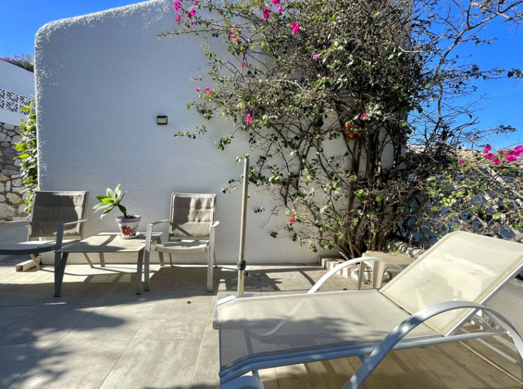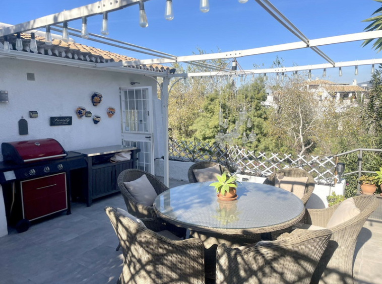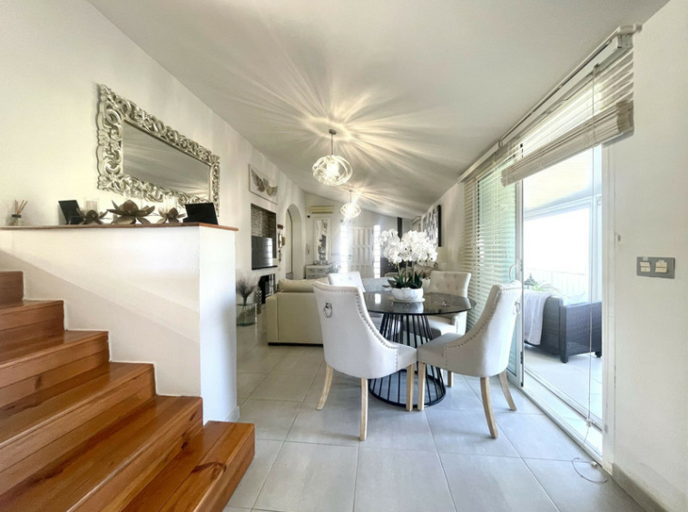 En un extremo de la sala de estar, unos pocos escalones conducen al dormitorio principal, una habitación espaciosa con amplio espacio de almacenamiento y la posibilidad de crear un cuarto de baño en suite si se desea. En el extremo opuesto, una escalera conduce a dos dormitorios de invitados, uno de ellos con cuarto de baño en suite, complementado con un elegante cuarto de baño familiar. En toda la propiedad, las habitaciones están decoradas con buen gusto y llenas de carácter, realzadas por techos inclinados que añaden una sensación de espacio y encanto. En la parte trasera de la sala de estar, una terraza cubierta recorre toda la longitud de la propiedad. Equipado con toldos retráctiles, este versátil espacio proporciona zonas adicionales para vivir y descansar durante todo el año, mientras se disfruta de unas hermosas vistas abiertas.