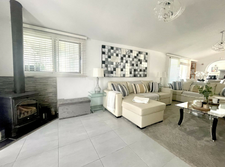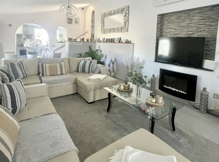 La propiedad cuenta con un camino de entrada privado y cerrado, un sistema de intercomunicación y se accede a ella desde el nivel de la carretera a través de una serie de escalones y terrazas exteriores, con entradas en ambos extremos de la villa. La entrada principal da paso a una amplia sala de estar y comedor, mientras que una entrada secundaria proporciona acceso directo a la cocina. La sala de estar cuenta con una llamativa pared multimedia y dos chimeneas, que crean un ambiente cálido y sofisticado. Esta zona fluye a la perfección hacia una cocina moderna y totalmente equipada, ideal tanto para la vida cotidiana como para el entretenimiento. Desde la cocina se accede a una amplia terraza para desayunar y hacer barbacoas, un espacio privado con pintorescas vistas a la piscina y al paisaje montañoso circundante.