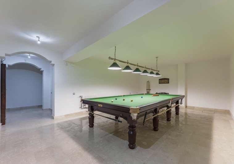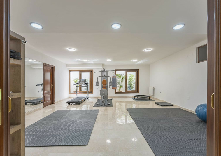 Hay una sala de billar y puertas correderas de madera por las que accedes a un gimnasio.