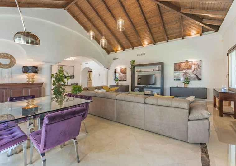 Al ingresar a la villa, hay un salón súper amplio con un hermoso techo de madera y