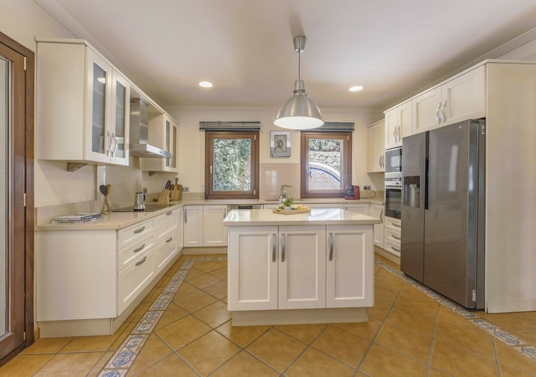 campana extractora y una isla central para uso adicional de la encimera.