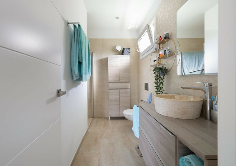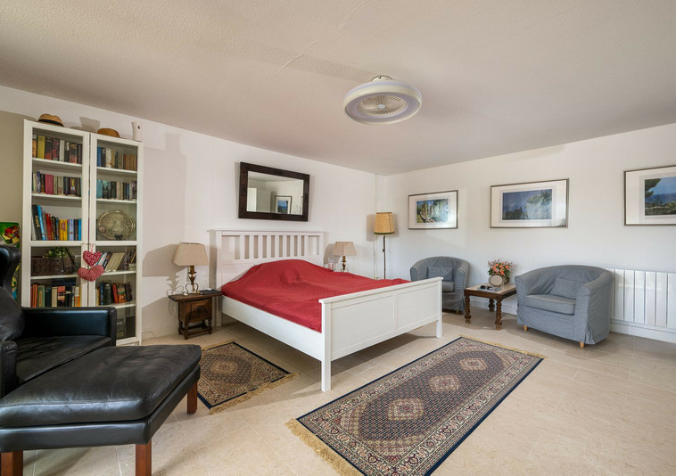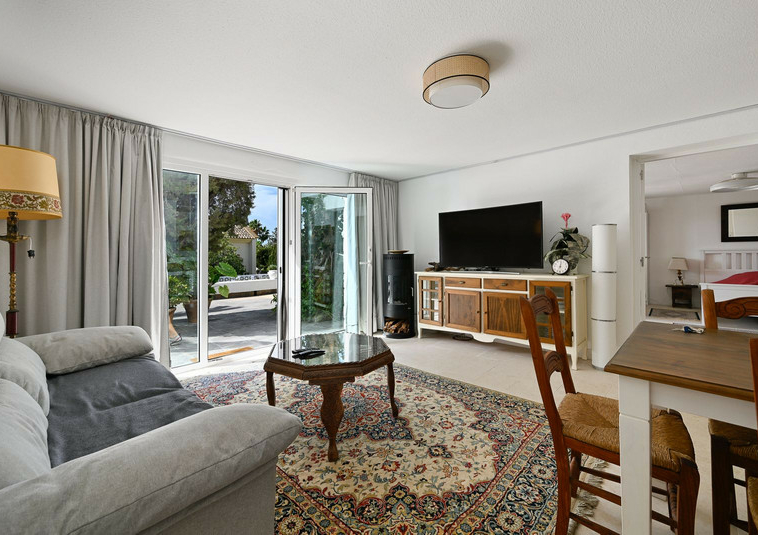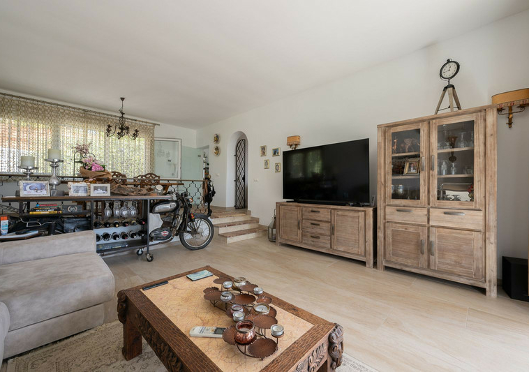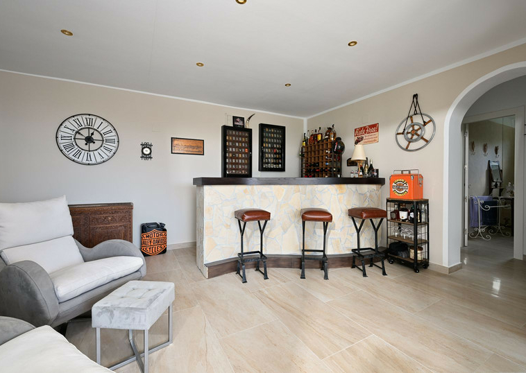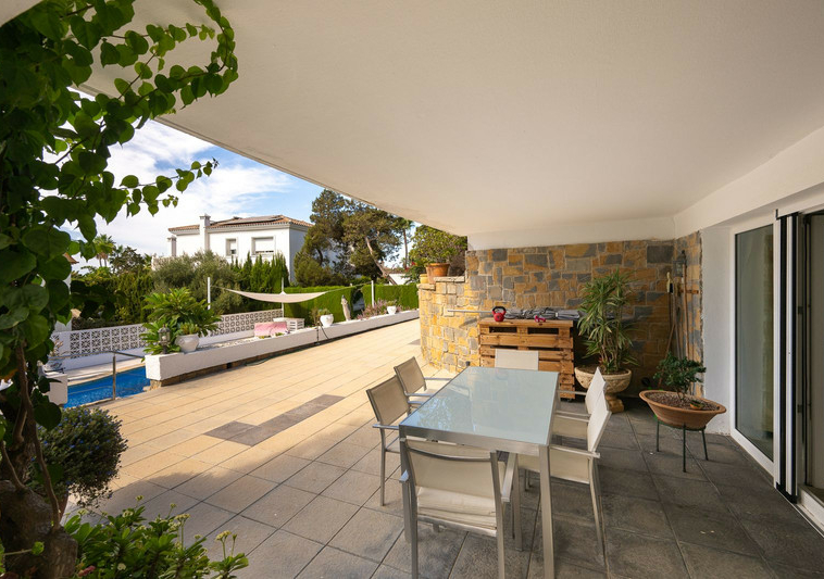 Planta principal con luminoso salón-comedor en dos niveles, amplia cocina, un dormitorio + baño con bañera y suite principal con baño en suite (ducha), zona de bar (fácilmente convertible en otro dormitorio) y terraza cubierta/barbacoa que da acceso a la piscina, la caseta de la piscina y la zona chill-out.