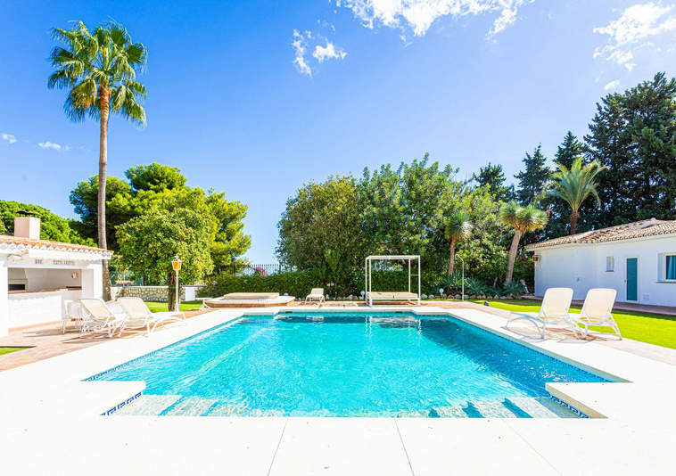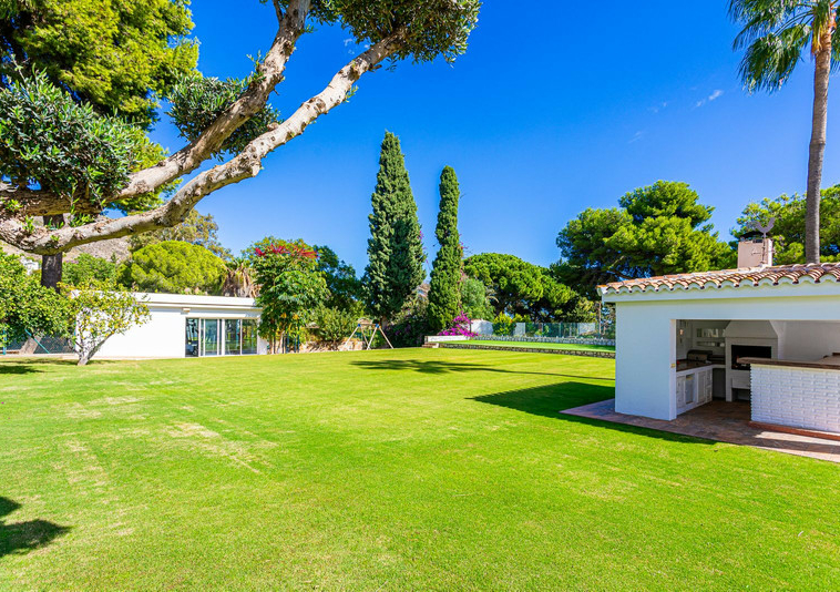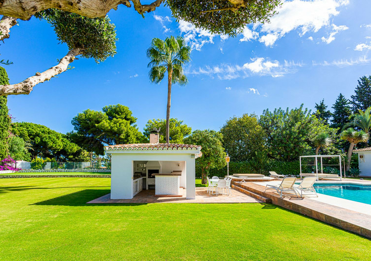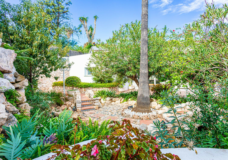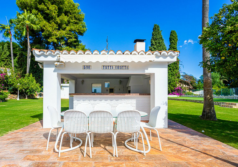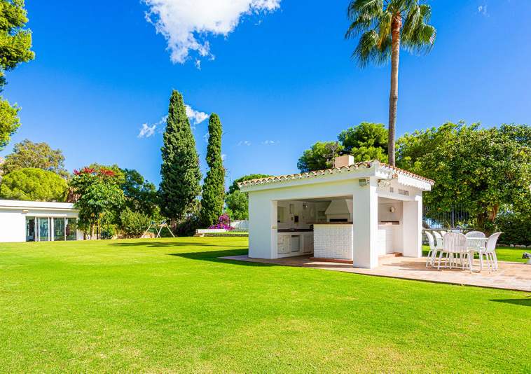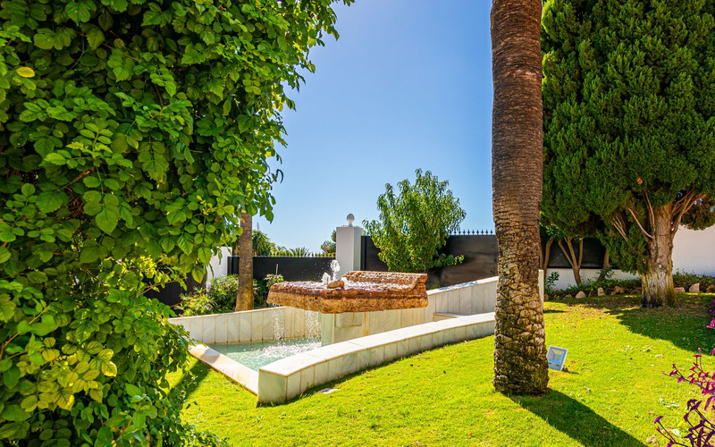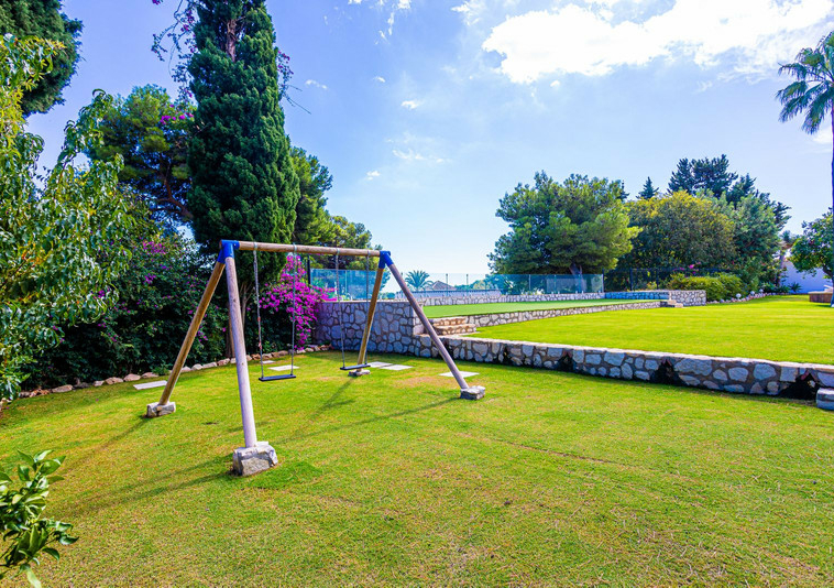 Jardin con diferentes zonas de relax con fuentes, piscina exterior de agua salada,barbacoa, juegos infantiles
