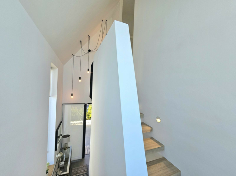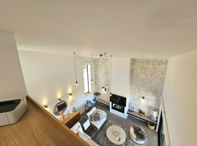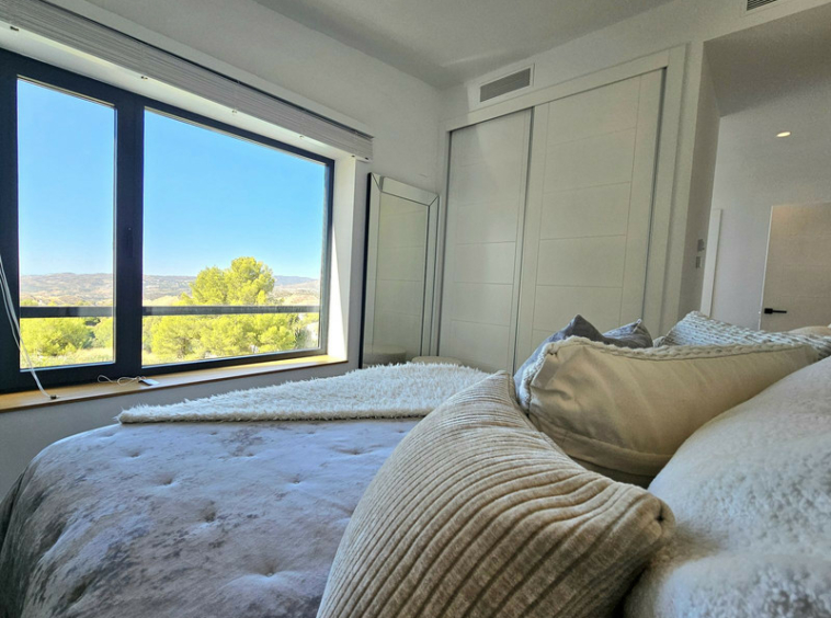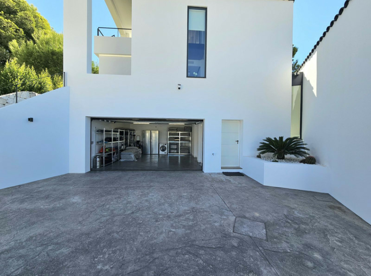 Villa de diseño con dos zonas bastante delimitadas, en una de ellas esta la zona de salon, comedor y zona social von gran porche y acceso a la piscina. En la planta superior el dormitorio principal con vestidor y baño y terraza con vistas a la montaña.