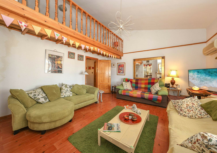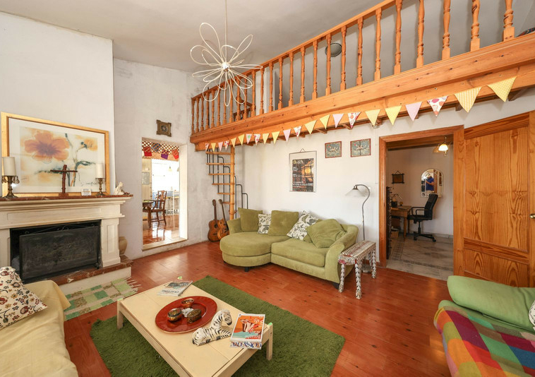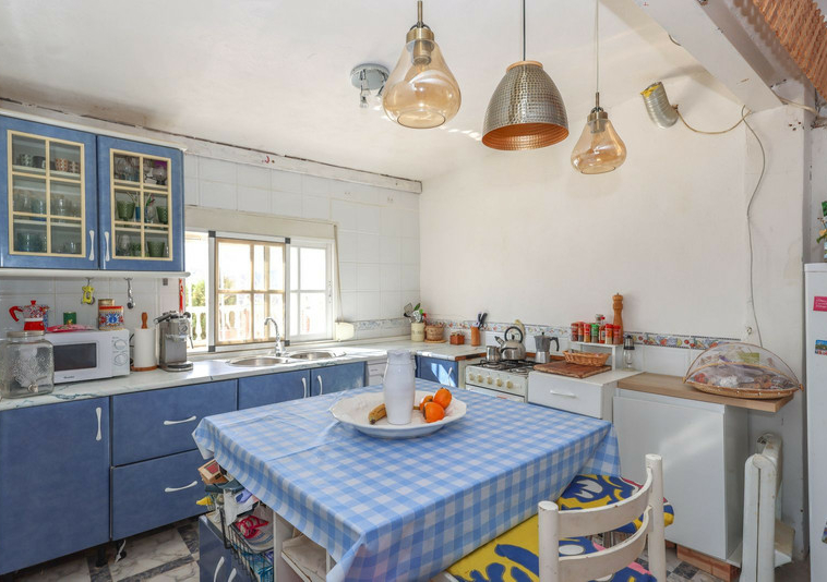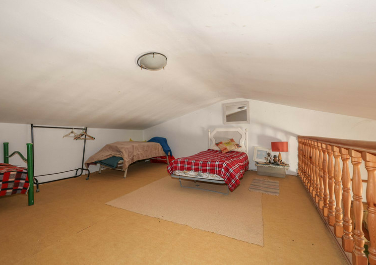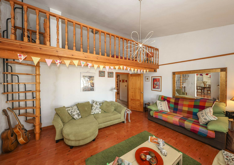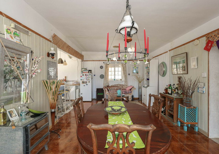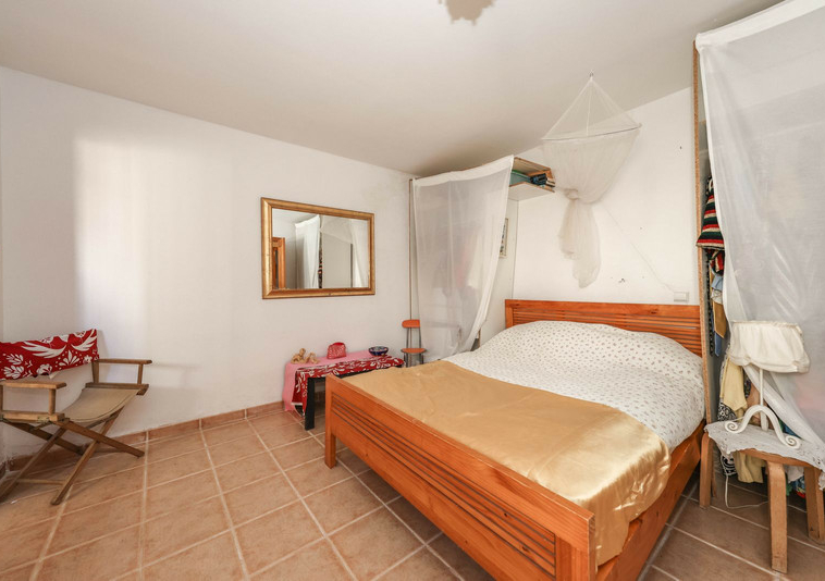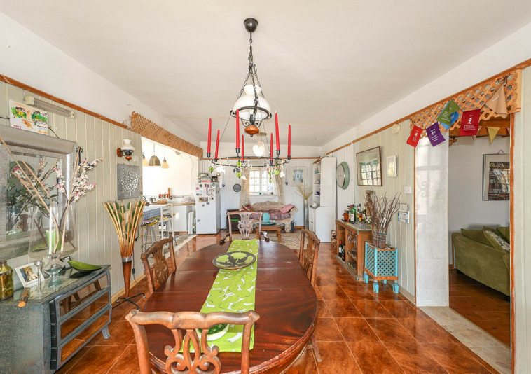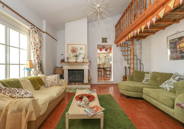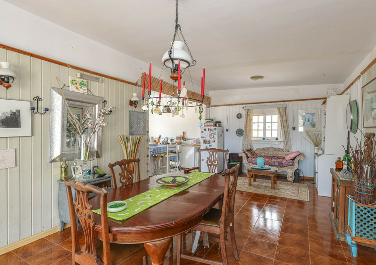 La casa es espaciosa y con mucho potencial, aunque necesita reformas. Grandes puertas correderas dan acceso a la zona central: un luminoso comedor con cocina integrada. A la derecha, encontrará el salón con altillo, ideal como dormitorio adicional o rincón de lectura. En esta parte de la casa también se encuentran dos dormitorios dobles, cada uno con su propio baño.