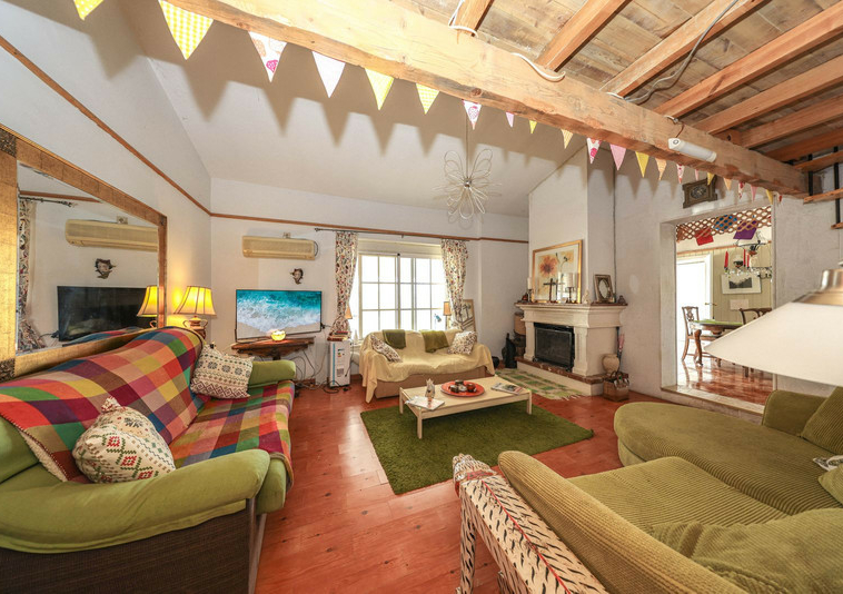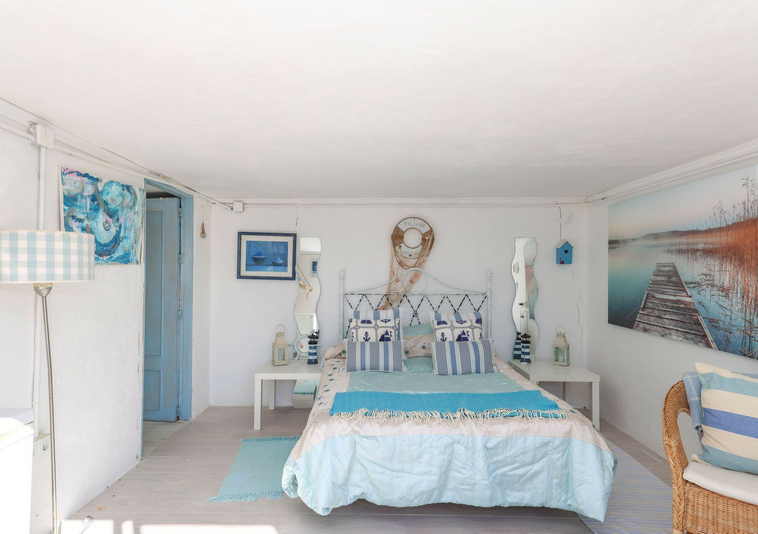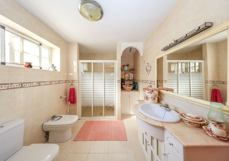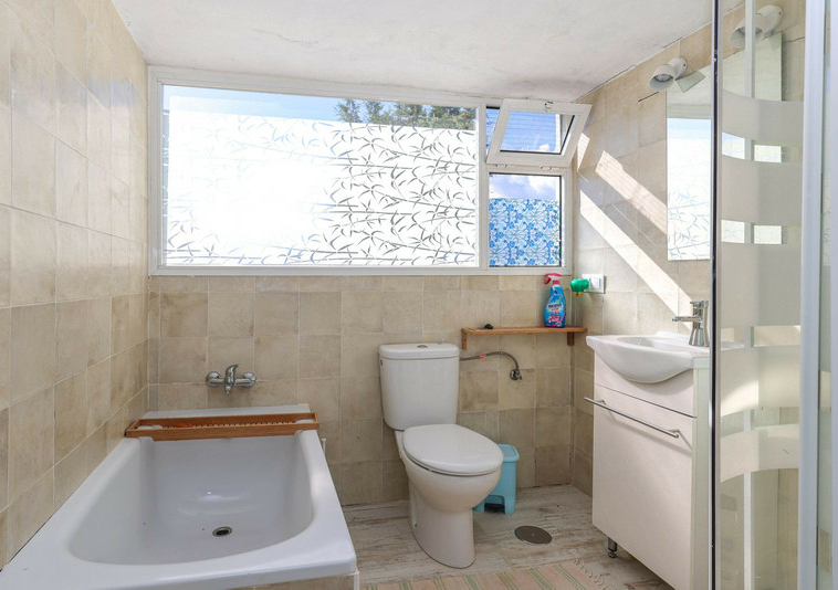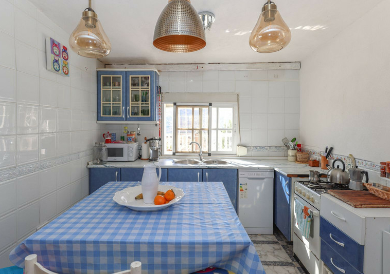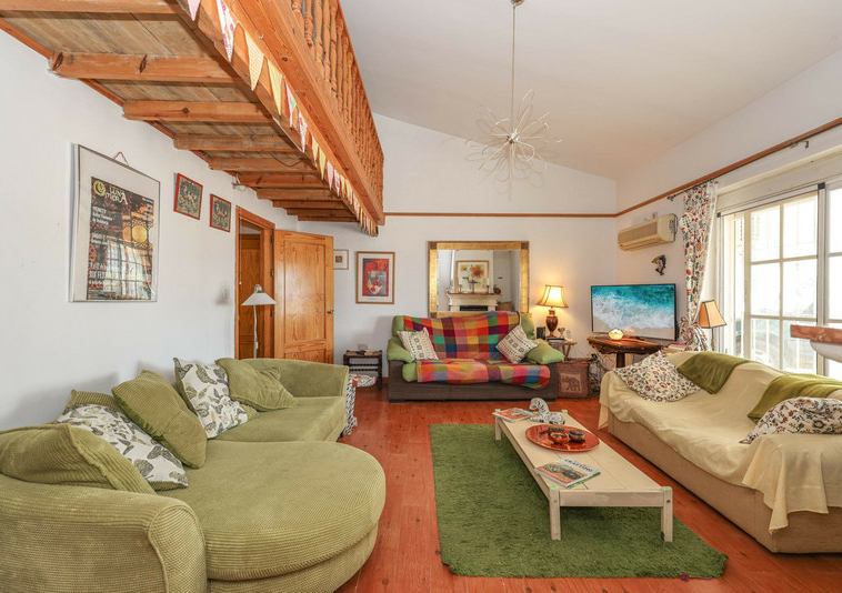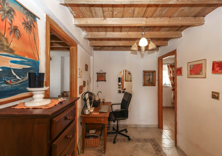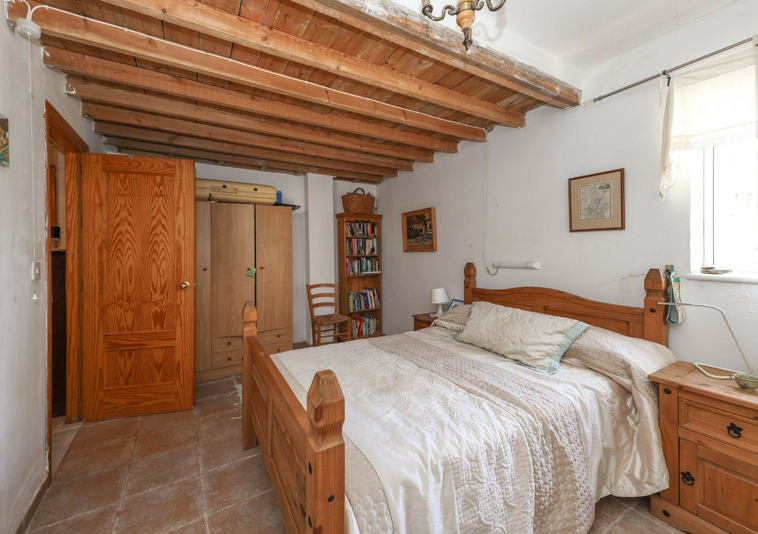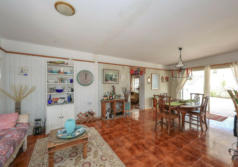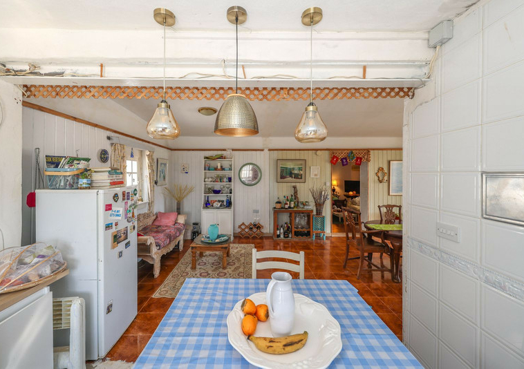 La casa es espaciosa y con mucho potencial, aunque necesita reformas. Grandes puertas correderas dan acceso a la zona central: un luminoso comedor con cocina integrada. A la derecha, encontrará el salón con altillo, ideal como dormitorio adicional o rincón de lectura. En esta parte de la casa también se encuentran dos dormitorios dobles, cada uno con su propio baño.